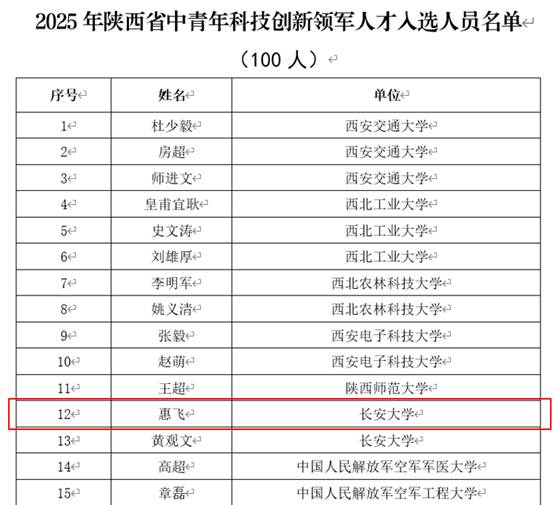 近日,陕西省科学技术厅发布了《关于公布2025年陕西省中青年科技创新领军人才、科技创新创业人才及2026年青年科技新星入选人员的通知》(陕科人才函〔2025〕355号),我院惠飞教授入选2025年陕西省中青年科技创新领军人才。