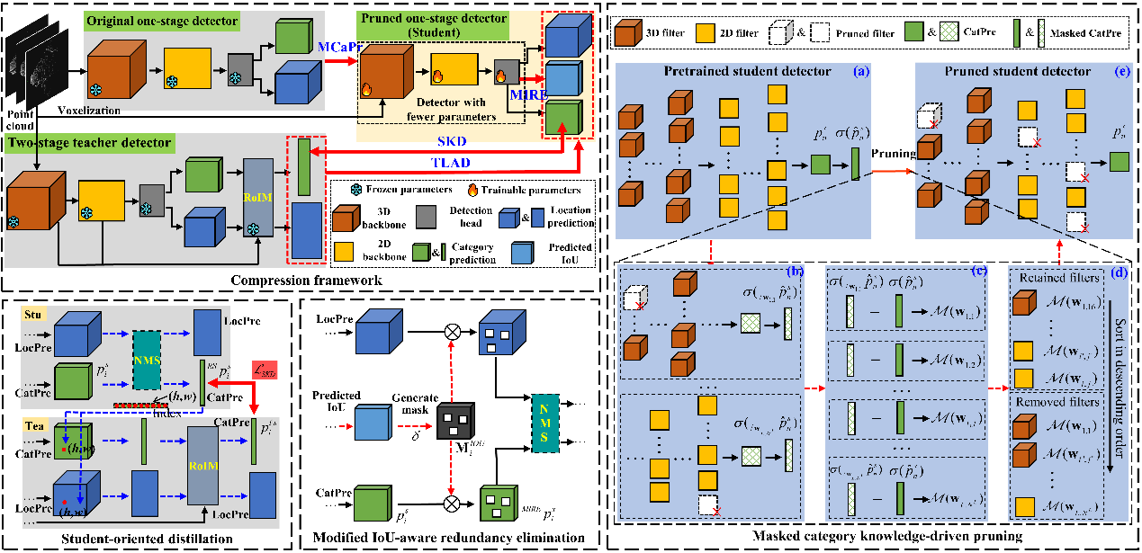 基于点云的三维目标检测网络在自动驾驶感知系统中发挥着重要的作用,然而大量的参数和重复的运算却限制了点云检测网络在实际资源受限车载平台上的部署。知识蒸馏技术(knowledge distillation)能够有效地获取轻量化点云检测网络,但传统蒸馏方案通常在同构网络之间传递有限的知识,并且它们没有充分探索最优的网络架构,这限制了学生网络的精度提升。为了解决上述问题,如图1所示,研究团队提出了一种类别知识驱动的网络压缩框架。首先,该方法提出学生驱动的预测蒸馏策略(student-oriented knowledge distillation, SKD)和两阶段知识驱动的标签蒸馏策略(two-stage-oriented label assignment distillation, TLAD),它们将两阶段检测网络的知识迁移至单阶段检测网络(异构蒸馏),从而避免同构蒸馏对网络精度提升的限制。另外,为了探索最优的轻量化学生网络架构,该压缩框架提出关键区域类别知识驱动的结构化剪枝方案(masked category knowledge-driven structured pruning, MCaPr),其通过移除架构前后,关键区域对应类别预测的变化来度量对应架构的重要性。此外,该压缩框架建立基于交并比的冗余预测消除模块(modified IoU-aware redundancy elimination, MIRE),以此来进一步移除冗余的假阳性预测,获取更高的检测精度。大量实验验证了所提出压缩框架的有效性,如在WOD-mini数据集上,该方法在将CenterPoint网络参数量减少5.2倍的情况下,精度(L2 mAPH)反而提升了0.55%。研究成果为点云三维目标检测网络在实际车载平台上的部署提供了有效的解决方案。